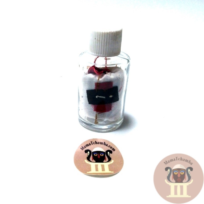Esta botella es de origen Africano (BENIN) , elaborada según tradiciones Africanas por el maestro YEKPON HOUNSOU LUCIEN , esta botella se rellena con aceite perfumado six flowers el cual usara usted para hacer sus peticiones , la puede usar para cualquier petición de amor , salud , trabajo , negocios , etc..