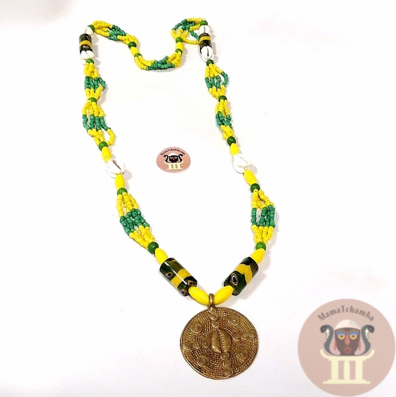 COLLAR MAZO DE ORULA ELABORADO CON CUENCAS VERDES Y AMARILLAS DE LA MEJOR CALIDAD,CARACOLES,CON CUENCA DE PIEDRA NATURAL AFRICANA PINTADA,Y MEDALLON DE SIMBOLOGIA DE COWRIER EN BRONCE.