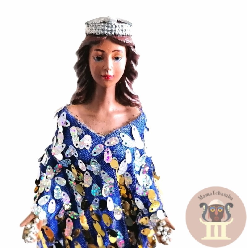 figura de resina de la orisha yemaya ,vestida con motivos dorados, azules, plateados 30cm