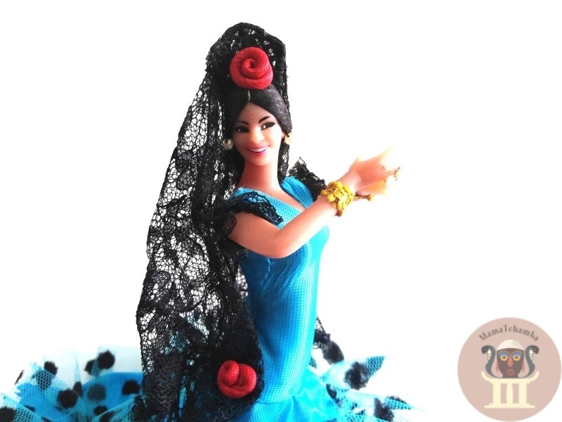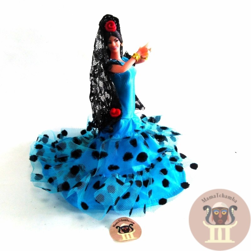 Muñeca gitana falda azul con lunares negros de 20 centímetros .