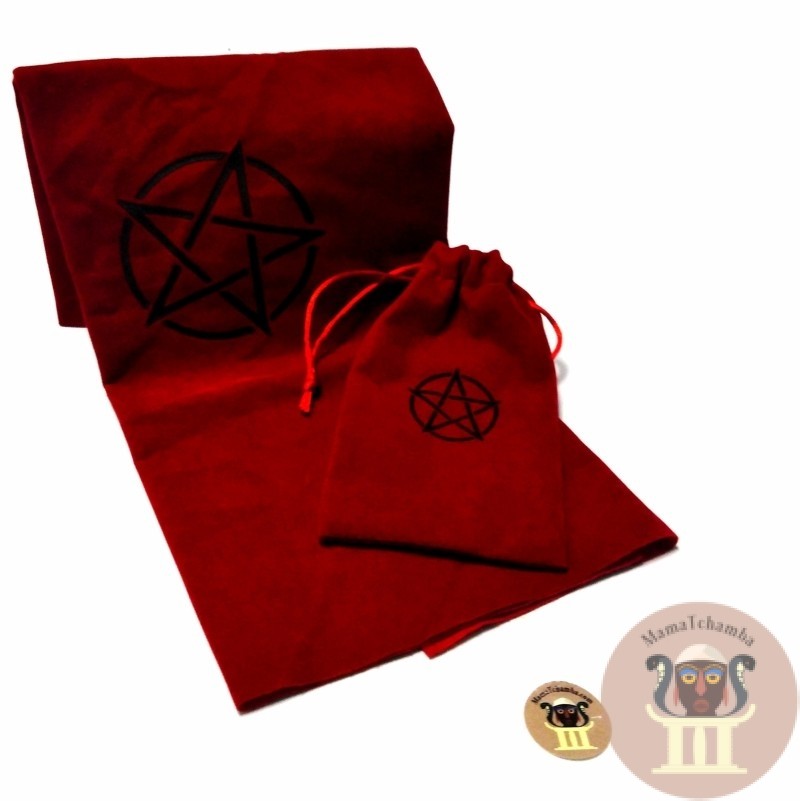 Tapiz rojo (50cm x 50cm) y bolsa para el tarot (18cm x 10cm).